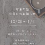 - 年末年始休業のお知らせ2025-2026 お休みについて いつも Relax in いる香 をご利用いただき、誠にありがとうございま… 続きを読む: 年末年始休業のお知らせ