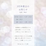 - 3月休業日のお知らせ【3月休業日のお知らせ】 いつも Relax in いる香 をご利用いただきありがとうございます☺️ 誠に勝手… 続きを読む: 3月休業日のお知らせ