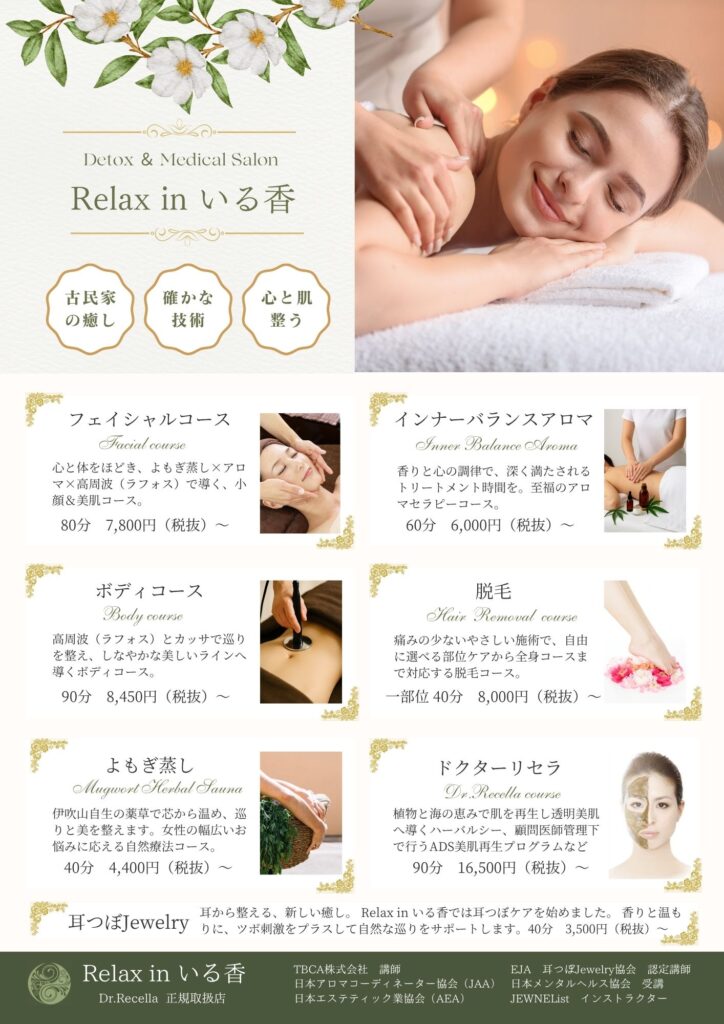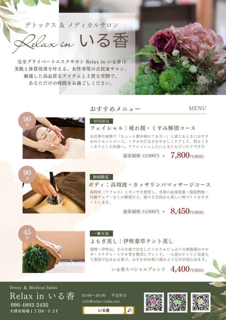 いつも Relax in いる香 をご利用いただき、ありがとうございます。このたび、サロンの新しいチラシが完成いたしました✨